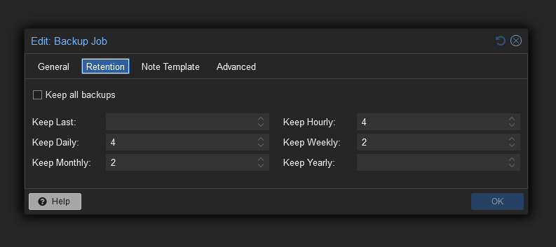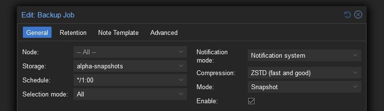 alpha/proxmox/snapshotsdataset via NFS asalpha-snapshots. - Backups from Proxmox are done hourly on the hour (**:00) and copied to