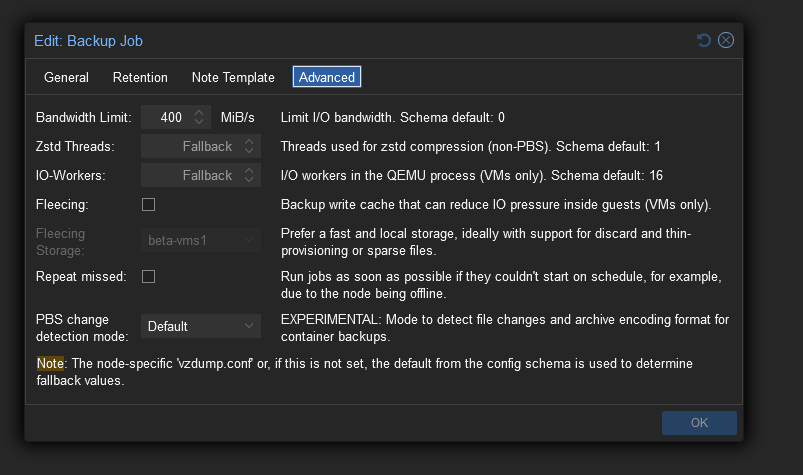 The only changed setting here is the bandwidth limit. The only reason it's set is to prevent completely hogging the disk I/O for several minutes. Yes, it takes longer as a result, but at least other services using the pool won't be I/O starved.